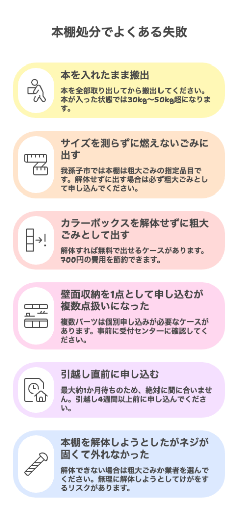 我孫子市では本棚処分で同じ失敗を繰り返している方が多いです。以下の6つの失敗パターンを確認しておいてください。