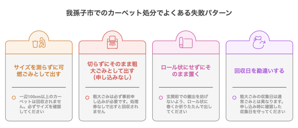 - サイズを測らずに可燃ごみとして出す:一辺100cm以上のカーペットは回収されません。必ずサイズを確認してください