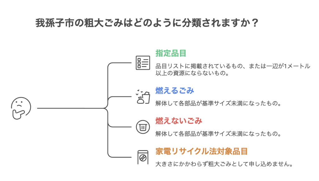 迷う場合は品目名で判断してください。我孫子市では家具・寝具・木製建具・電化製品・趣味遊具などが指定品目として一覧化されています。「これは粗大ごみか」と判断できない場合は、粗大ごみ受付センター(04-7181-5374)へ事前確認することを推奨します。