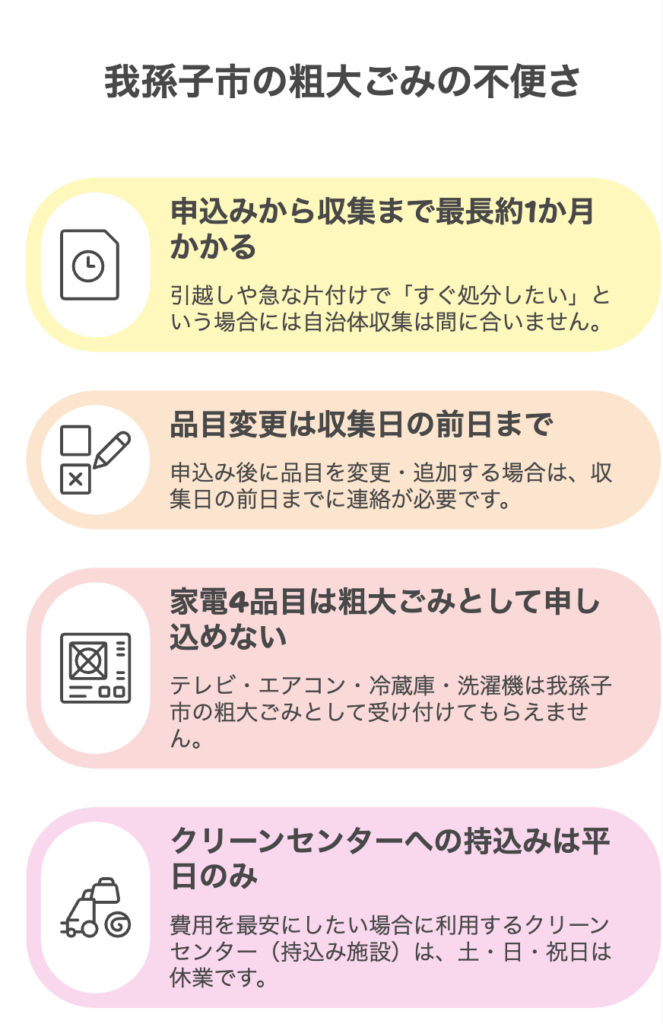 我孫子市では、粗大ごみの申込みから回収まで最長約1か月かかります。引越しや急な片付けで「今すぐ処分したい」場合、自治体では間に合いません。