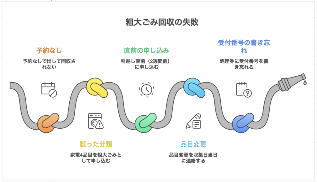 我孫子市では毎年同じパターンの失敗が繰り返されています。特に初めて粗大ごみを出す方が陥りやすい失敗と対策を確認してください。