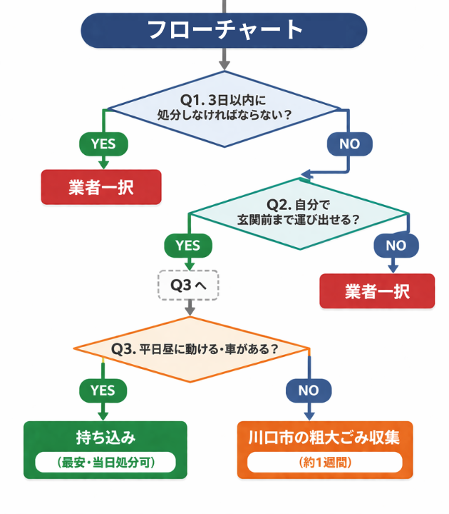 Q3. 平日昼に動ける・車がある?YESなら持ち込み(最安・当日処分)NOなら川口市の粗大ごみ収集(約1週間)