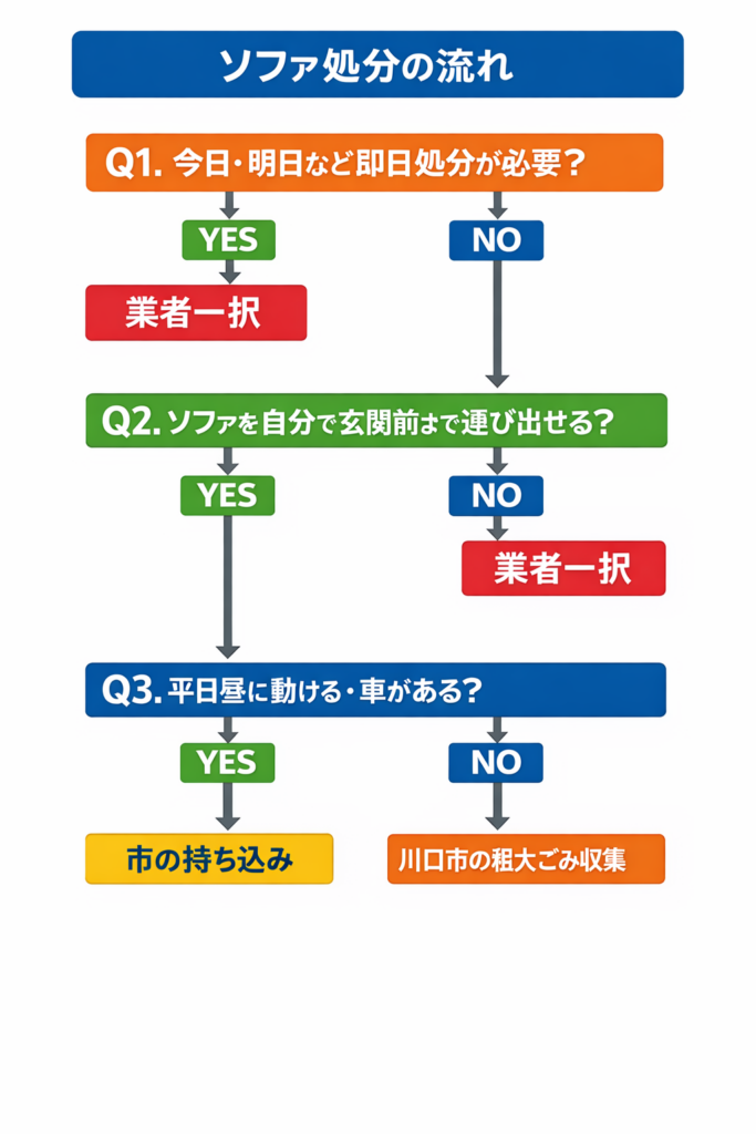| Q3. 平日昼に動ける・車がある? | YESなら市の持ち込み(最安・当日処分) | NOなら川口市の粗大ごみ収集(約1週間) |